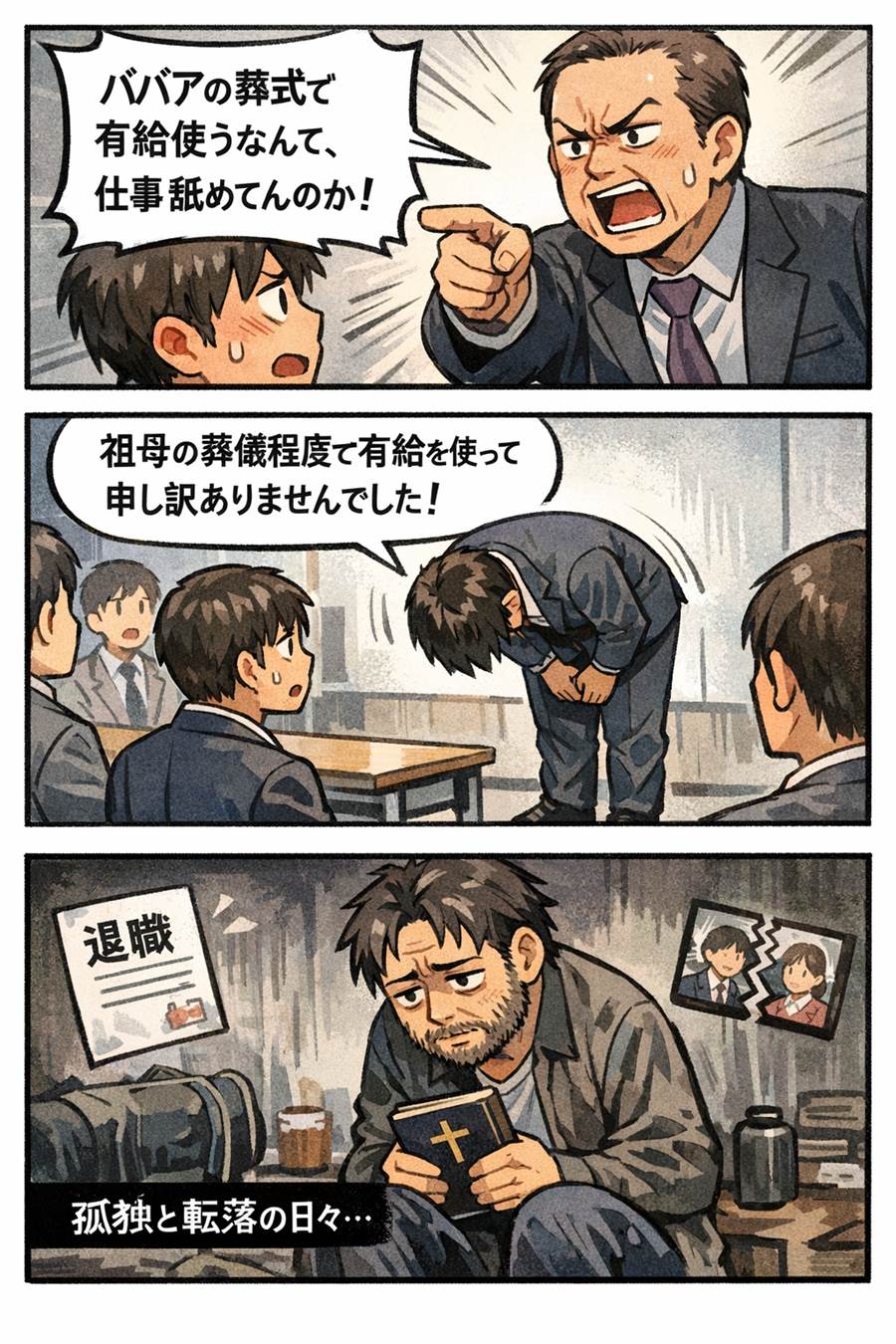 ある日、祖母が他界したとの報せを受け、忙しい時期でも家族として葬儀に参加するため有給を申請した。しかし出社すると、上司から「ババアの葬式で有給使うとか仕事舐めてるんじゃないか」と冷たい言葉を浴びせられ、呆然とした。