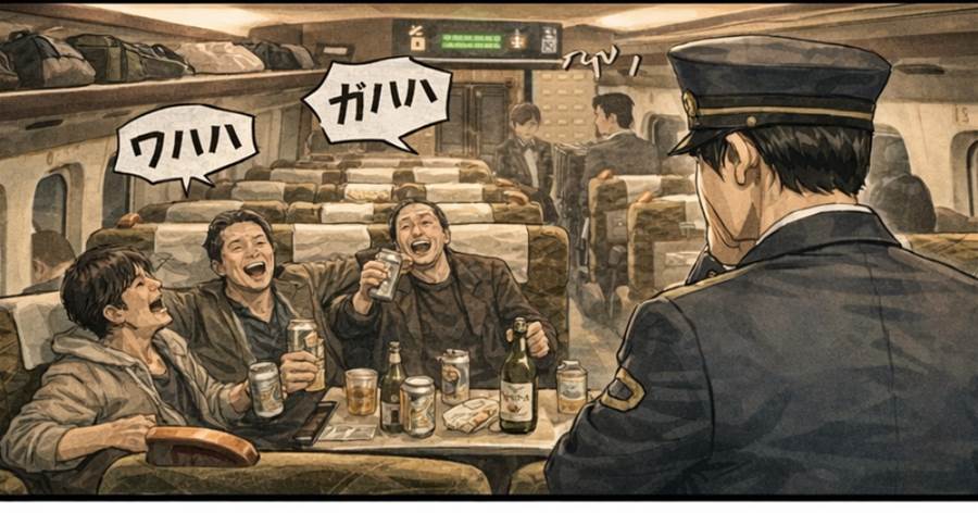最初は我慢した。しかし10分、20分と経っても宴会は続く。笑い声、テーブルを叩く音、酒の匂い。隣の女性も前の男性も明らかに困っている。それでも、酔っ払い相手に誰も注意できない。