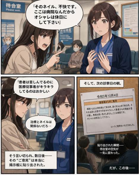 私は薄いベージュのネイルをしていた。病院の規定内で、業務にも問題はない。