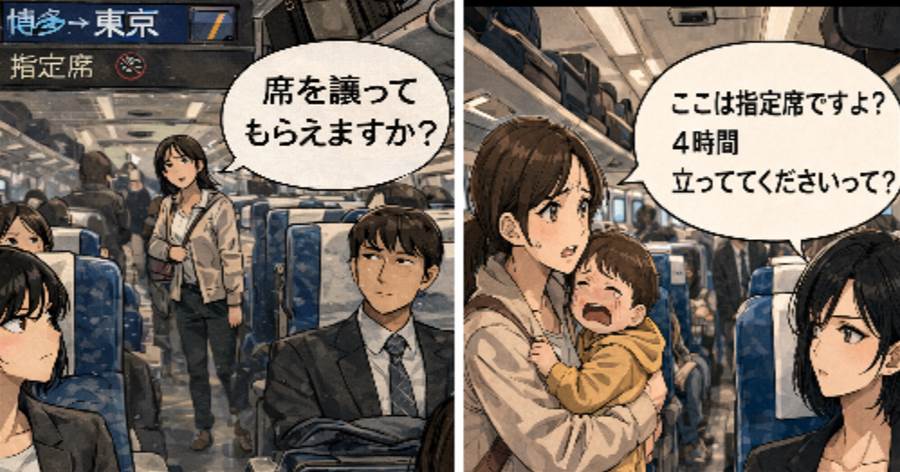 指定席で眠る親子に「ここ私の席です」と声をかけたら、父親は「自由席でしょ」と反論。チケットを見せると、「子供が寝てるのに…」と主張。発車直前、親子はしぶしぶUターン。父親の顔は青ざめ、私はスッキリ!