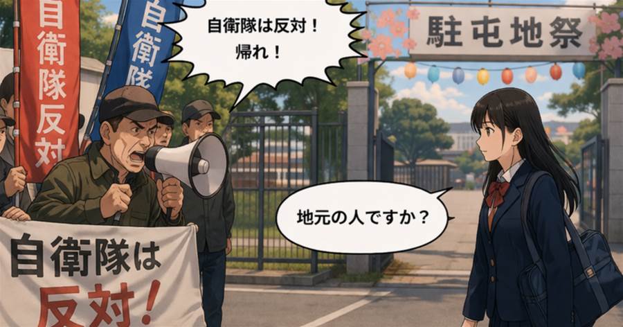 自衛隊の駐屯地祭が開催される会場の外で、「自衛隊は反対!」と大声で抗議する団体が集まっていました。そこに制服姿の一人の女子高生が静かに歩み寄り、拡声器を持つリーダーの前に立ちました。彼女は驚くほど冷静に「地元の人ですか?」と尋ねます。リーダーが「全国から集まった」と答えると、彼女は少し間を置き、冷徹な一言を放ちました。その言葉が(続)、