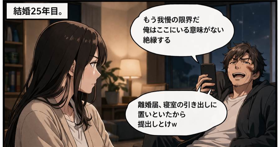 結婚25年目に夫が絶縁宣言「離婚届を置いたから提出しとけw」私「分かったわ」→お望み通り別れた3か月後、ズタボロの夫「…どうして言わなかった!」実はw