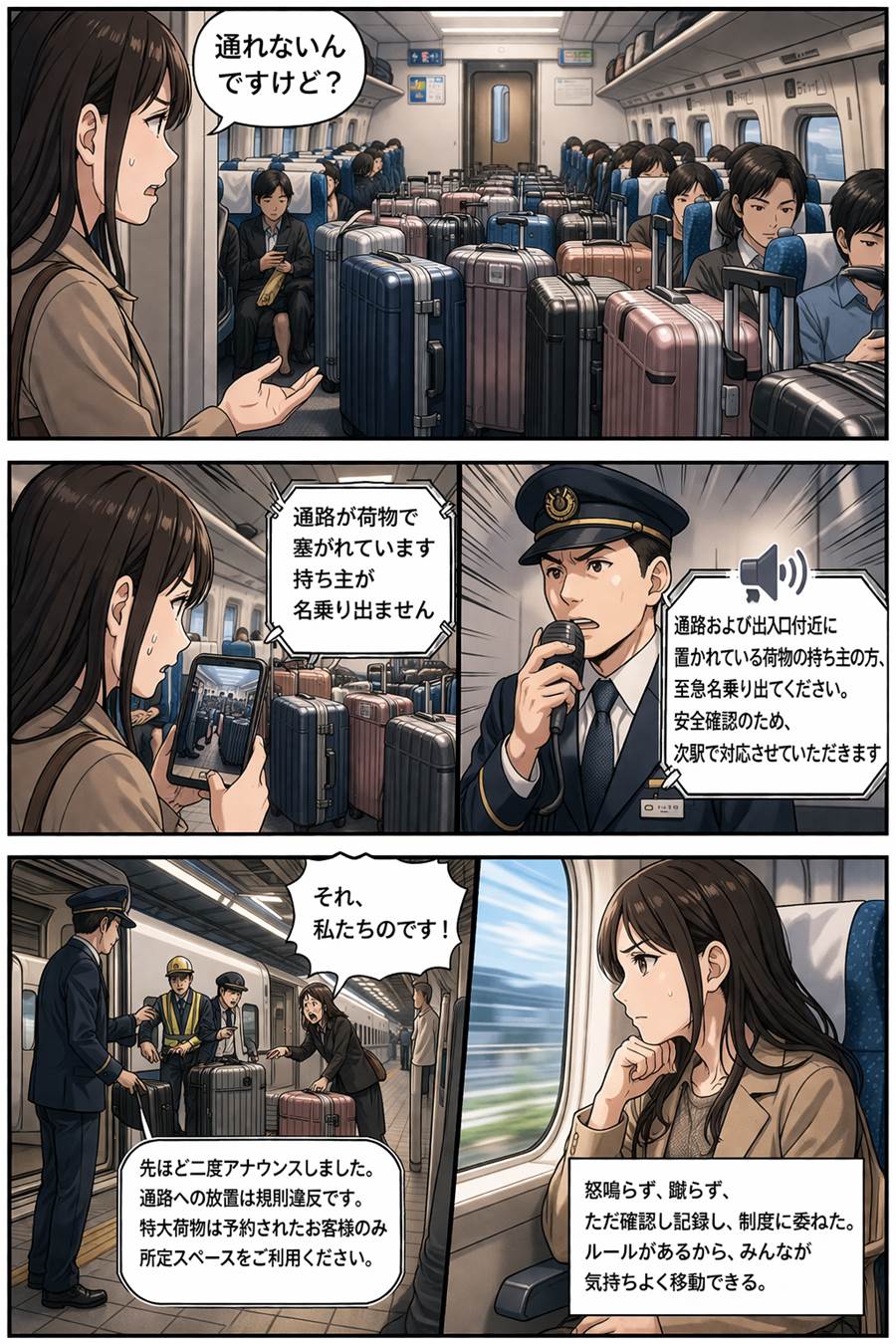 「先ほど二度アナウンスしました。通路への放置は規則違反です。特大荷物は予約されたお客様のみ所定スペースをご利用ください」